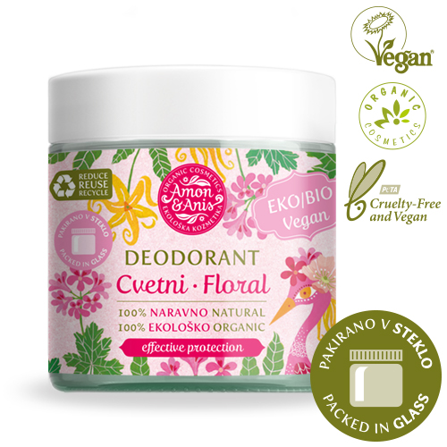Ekološki kremni deodorant Cvetni je ročno izdelan iz naravnih in ekoloških sestavin s 100% deležem naravnih in 100% deležem ekoloških sestavin v izdelku. Naravni deodorant je zelo učinkovit, kljub naravni sestavi in ne vsebuje sintetičnih kemikalij.